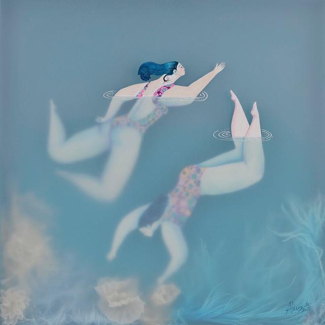 在觀賞著一幀幀繪畫作品,我的眼睛無法離開在水中自在漫遊的女性,彷彿與畫中角色產生了連結,受到思緒的牽引。Sonia Alins 表示,他期望透過水與情感之間的交融,產生感受連結,畫中角色與水之間的互動,使觀者可以感受到角色的靈魂,在包容一切的水中,所有情感能量無論是痛苦、恐懼、悲傷、歡樂,一切都是可以共享的。