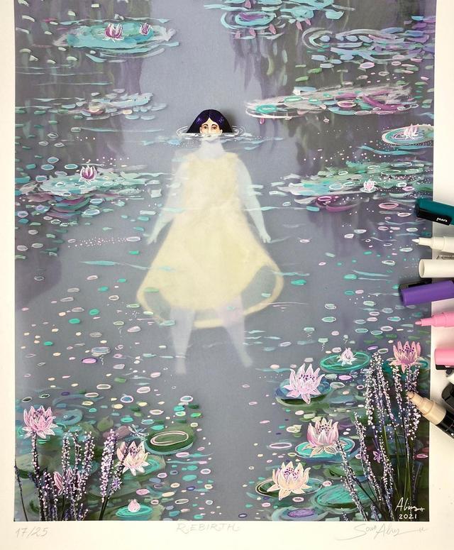 有人以「柔情似水」形容女性的曼妙、思緒、神情,西班牙插畫家 Sonia Alins 也以「水」抒發女子的柔美、闡揚細膩的情感,在觀賞畫作時,可以見得他超越二維空間限制的創作,由透明片,和其他材料拼貼而成的作品,使觀者們可以將超現實主義、浪漫主義和女性主義,「三位一體」相互交融、聯繫。