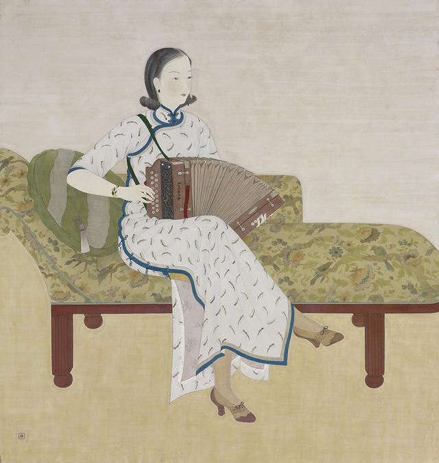 陳進,《手風琴》,1935,膠彩、絹,180×170公分,臺北市立美術館典藏。