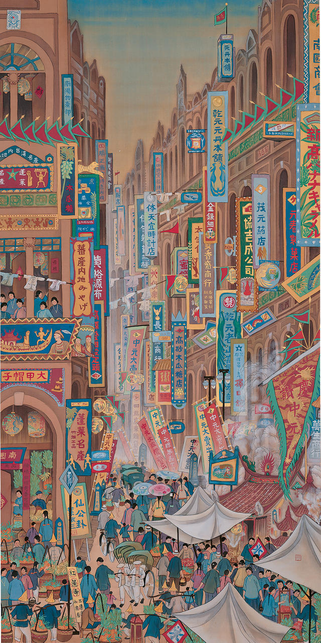 郭雪湖,《南街殷賑》,1930,膠彩、絹,188×94.5公分,臺北市立美術館典藏。