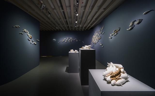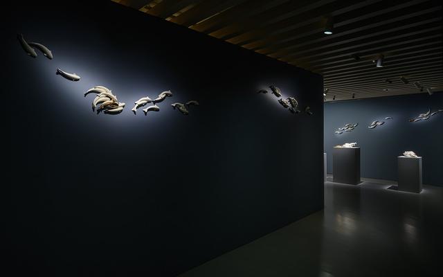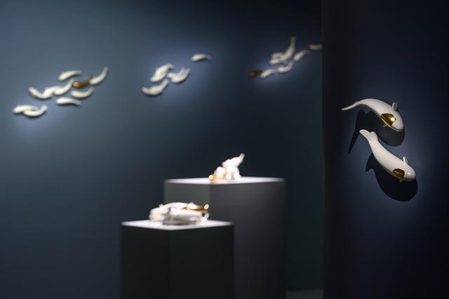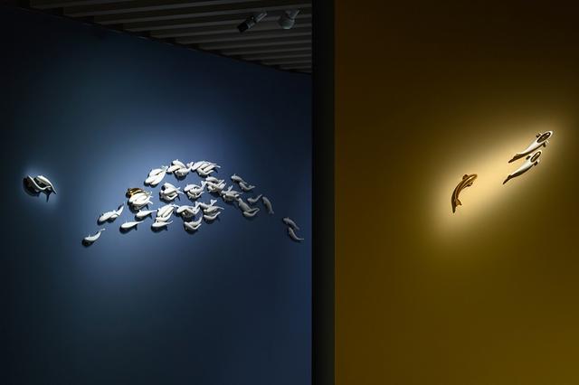 展覽名稱同名作品〈餘 Abundance〉是汲取華人文化的「餘」之意,透過「魚」的形體和意象創造而成,在充滿圓弧曲線的展間裡,會看見一隻隻的魚,緩緩地游進漆上灰藍色牆面的空間中,即興組合擺放,蔓衍成各自獨立又融合於整體的群組,由細而繁,構成有機的流線與動向,呈現動態的自由感,尤其在疫情影響下的行動自由變成了一種奢侈,寄望魚群優游大海的自由。除了白瓷外,少數的「金魚」也點綴其中,優雅耀眼的金漆隱於其間而成視覺定錨。