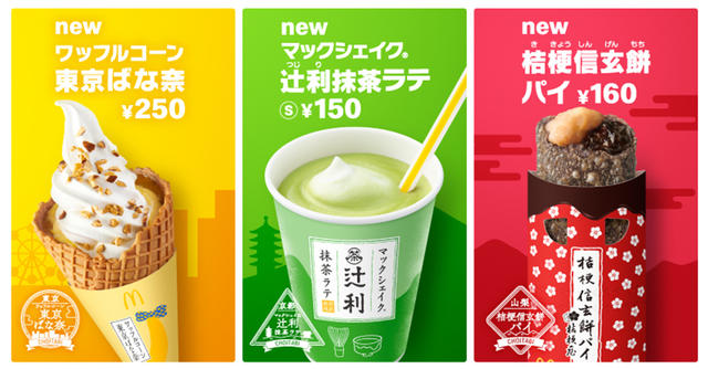 以日本各地名產大玩聯名的行銷不算少見,像是日本星巴克就曾一口氣推出47個都道府縣限定星冰樂口味,不過麥當勞則選擇推出不同田時品項,以「麥當勞小旅行」(マックでちょい旅)為主題,分別以東京、京都與山梨特色名產玩聯名,將各地名產融入麥當勞餐點中,讓饕客來趟舌尖上的旅行。