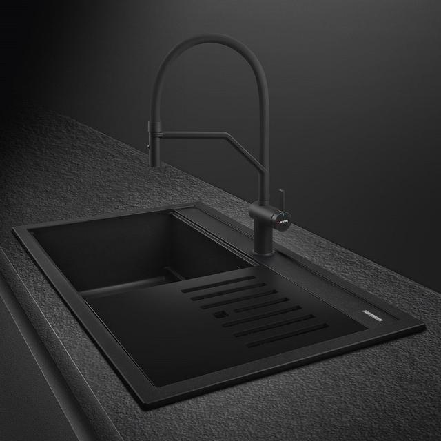 滿足了機能需求,除了彩色伸縮龍頭外,能與之相襯的Smeg花崗岩水槽,同樣擁有多種色彩,其具有密度高、堅固耐用的特性,也因此不易殘留細菌且擁有優異的抗汙效果,讓使用者能依照喜好搭配廚具或裝潢風格挑選,創造令人迷戀的夢幻廚境。