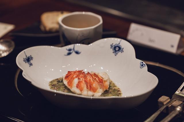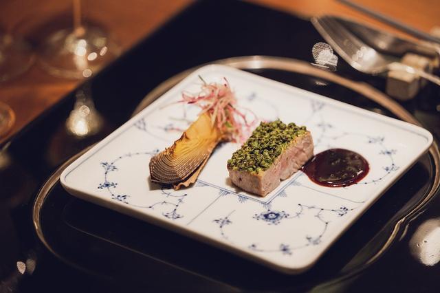 套餐內選用屏東東港當季黑鮪魚融合平邊唐草方盤,釋放藝術品般低調奢華的光芒,以炭烤手法低溫烹飪,巧妙運用丹麥代表性料理手法煙燻使鮪魚沾染香氣,細嫩肉質入口即化,清爽開啟序曲。