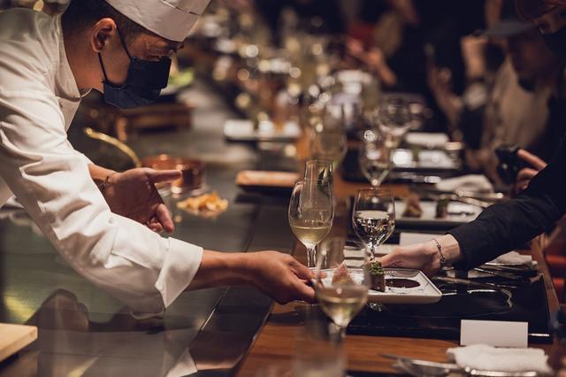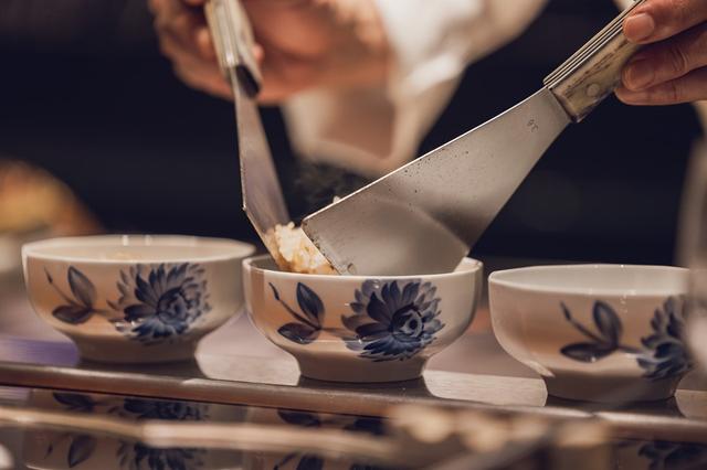 還有以島國特有的食材海藻鹽蒸龍蝦,以澎湖及北海道海藻燉煮的醬汁,襯托肉質原味鮮甜,搭配具東方古典感的棕櫚花園雲朵缽,佐餐麵包由烘培師傅特製,以孜然奶油和馬告呈現丹麥經典開放式三明治概念。最後再以綻藍花火球花款式小碗,承裝高雄UKAI亭招牌「蒜香炒飯」,風味十足的經典好味道作為完美收尾。