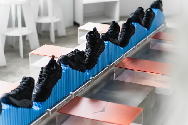 上到 2F,多元樣式的Q彈媒材接力登場,HOKA 雙系列鞋款也在此區域展示,其中 GLIIDE 系列的跑鞋 Bondi 8、Clifton 9 與 Kawana 三款時下最受戶外與潮流風格熱愛的穿搭鞋款,透過巧妙的垂吊燈飾進入客席區中,讓品味咖啡的過程,可以近距觀看 HOKA 跑鞋的設計細節;通往戶外探險大門的 SKY HIKE 系列登山鞋款 Kaha 2、Anacapa 與 Hopara 陳列於中島座位,並運用緩震泡棉構建呈現上下陡坡,鞋款採用黃金大底展現全方位緩震支撐,讓戶外生活、都市探險都更加穩定舒適。