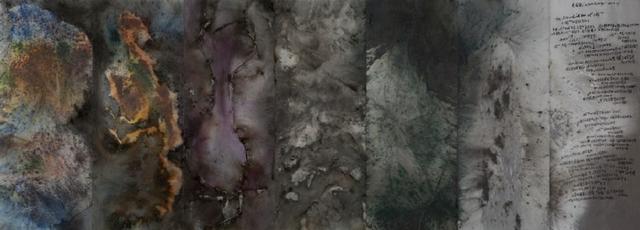 蔡國強《再燃烽火臺:為外星人作的計畫第八號》,1991年,火藥、紙、墨,裝裱於木制八扇屏風,東京都現代美術館收藏。