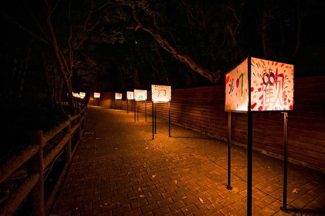 夜晚的火龍果⽥點著燈光,像是「希望之光」;那是台灣不為⼈知的美麗幻景,在⾼速公路晚上急馳,會突然出現的光之⽥地。在藝術作品中,將不會有真正的果實,卻有無數影影綽綽的枝枒影⼦在地上,呈現⼀種超現實主義的觀感。