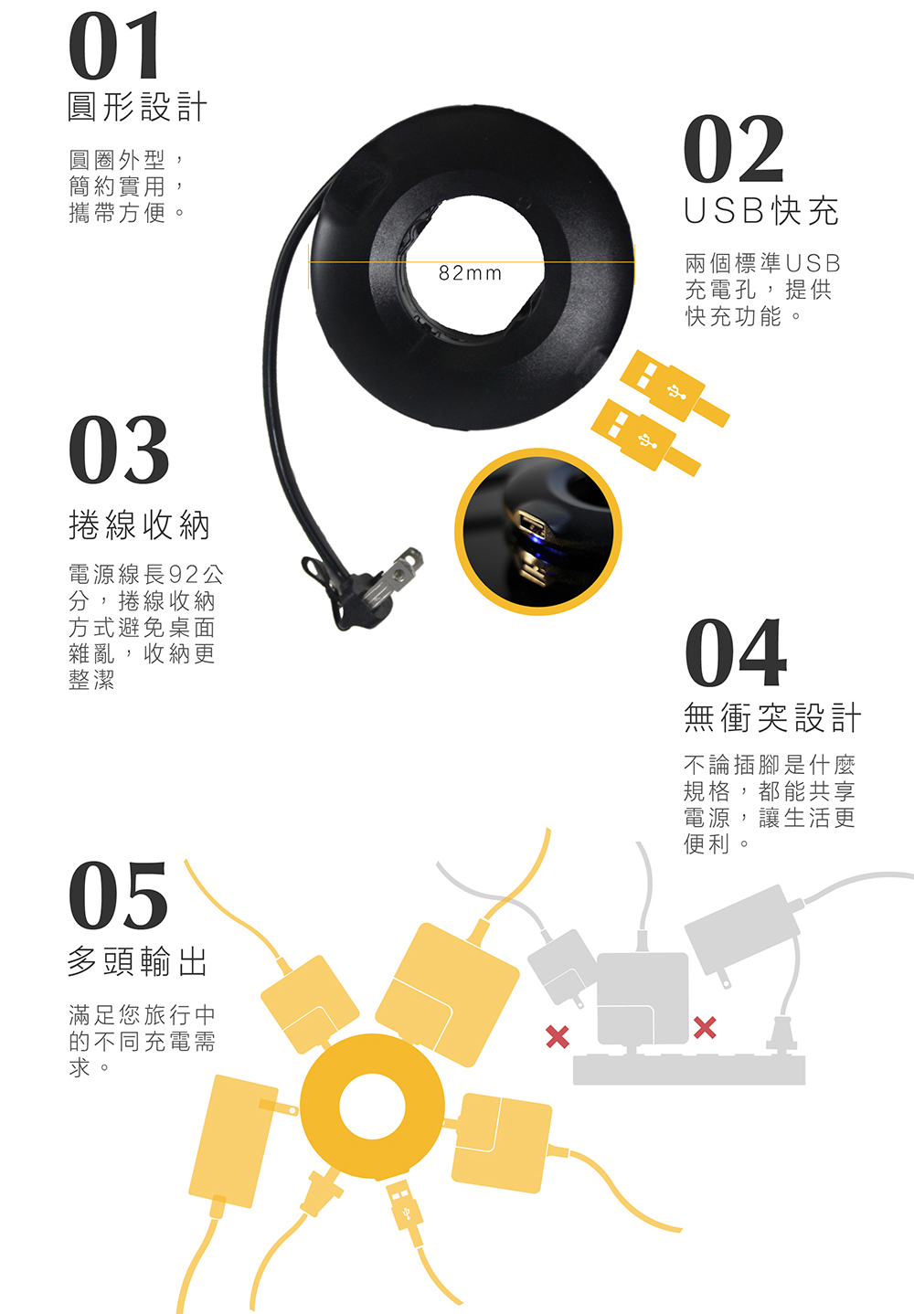 機體規格,有五個美規插座、兩個USB插槽,線長92cm,體積就跟一個甜甜圈一樣,總重量才 109g,對於錙銖必較的行李箱重量來說幾乎不造成過多負擔。