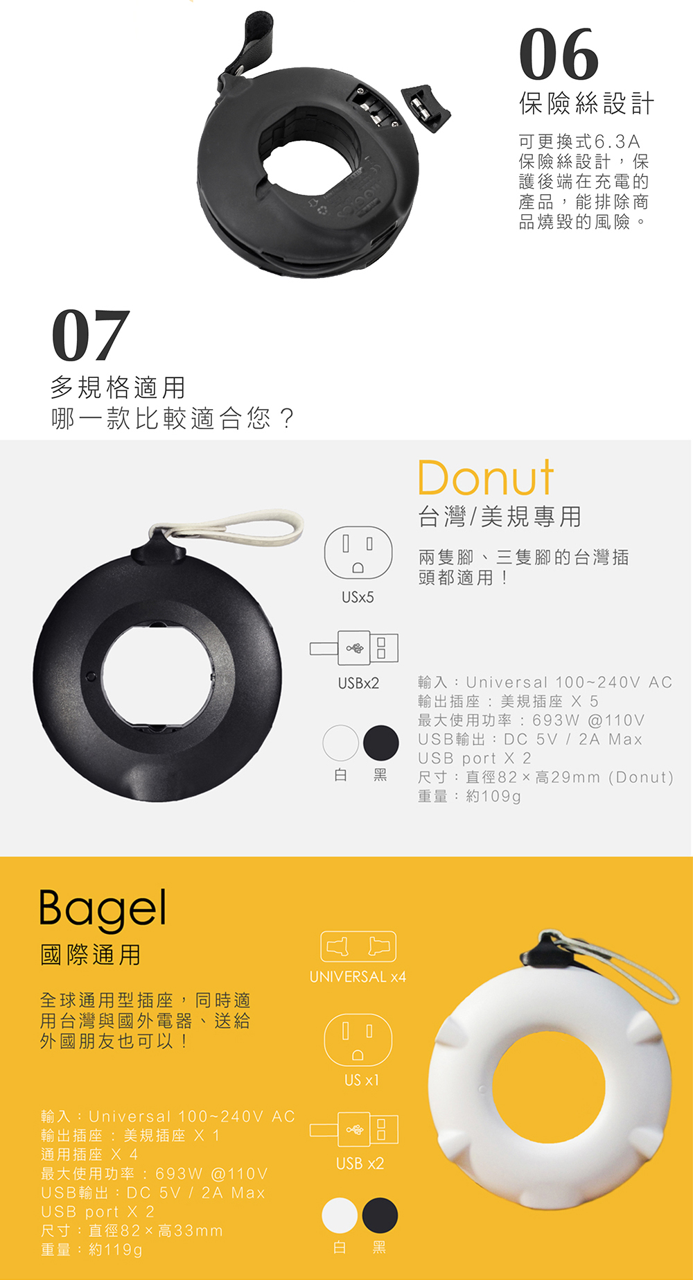 通用各國規格、線材可回捲收納、防雷擊抗突波、以及安全保險絲設計