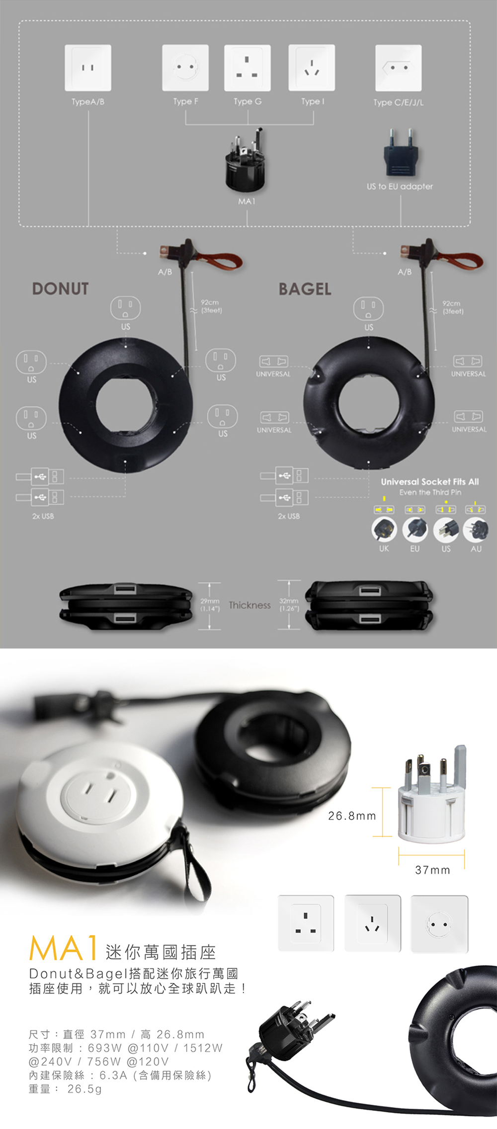 專為旅行設計的 MOGICS Dount,除了好收好帶好輕巧之外,另一個重點精髓當然就是要能符合各國的電壓規格,這裡的關鍵就在於中間那張冏臉---「MA1 迷你萬國插座」上面了!