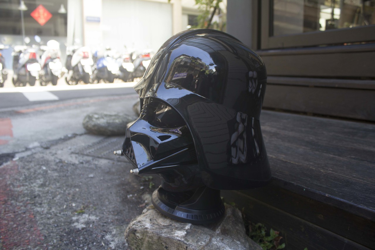 像是亮面漆黑外型的黑武士,在招牌頭盔底下,開機後雙眼和盔甲下方會發出黯黯紅光,搭配上令人窒息的呼吸聲,藍牙連線時則帶有光劍聲。