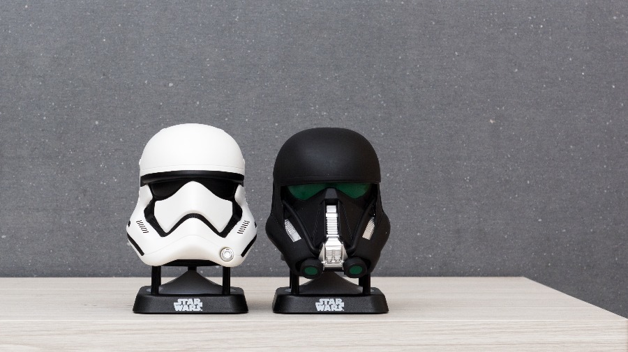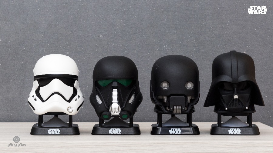 - 1:1 大小藍牙喇叭造型有:黑武士頭盔、帝國風暴兵頭盔、帝國風暴兵頭盔血腥版、俠盜一號死亡部隊頭盔
