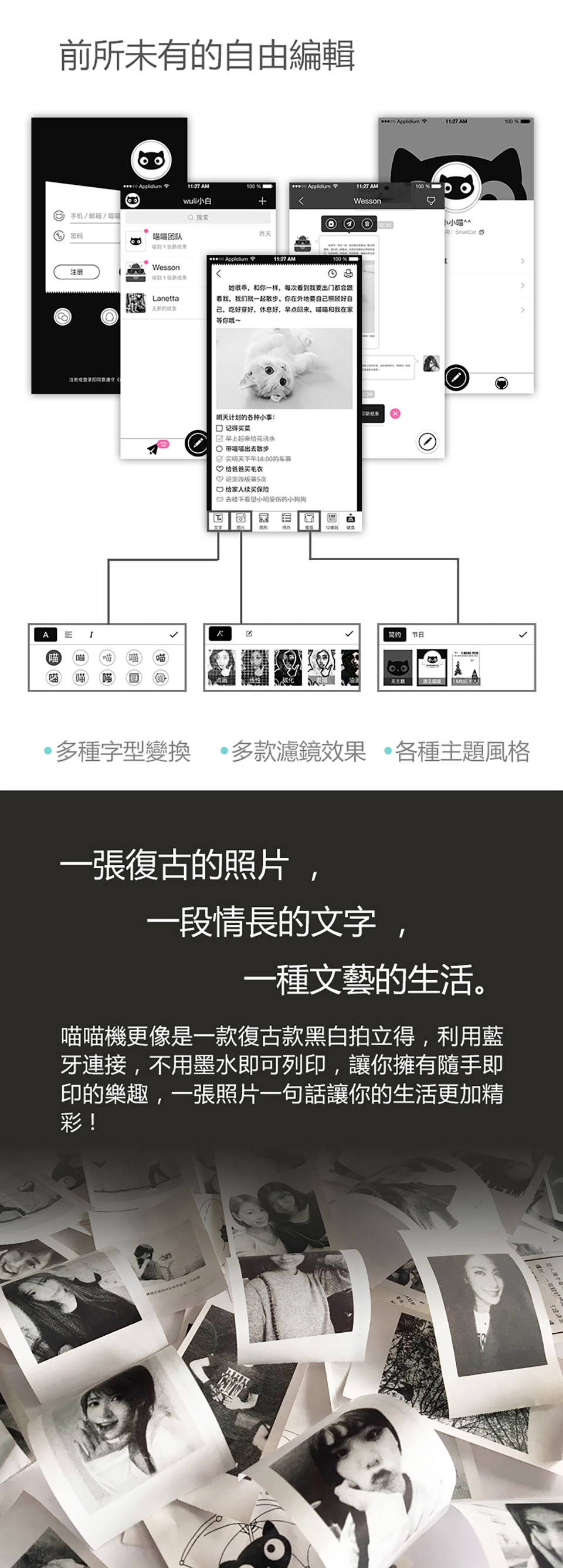 一台喵喵機再加上專屬 APP,豐富的編輯功能讓你能隨性加入可愛的圖案插畫、圖片濾鏡效果,以及畫龍點睛的文字,幫你的心情點滴與旅行的回憶照片立刻加分,成為手帳本上最特別的印記。而且額外的優點是喵喵機所列印出來的紙張相當輕薄,即使貼再多張也不容易讓本本變得又凸又厚。