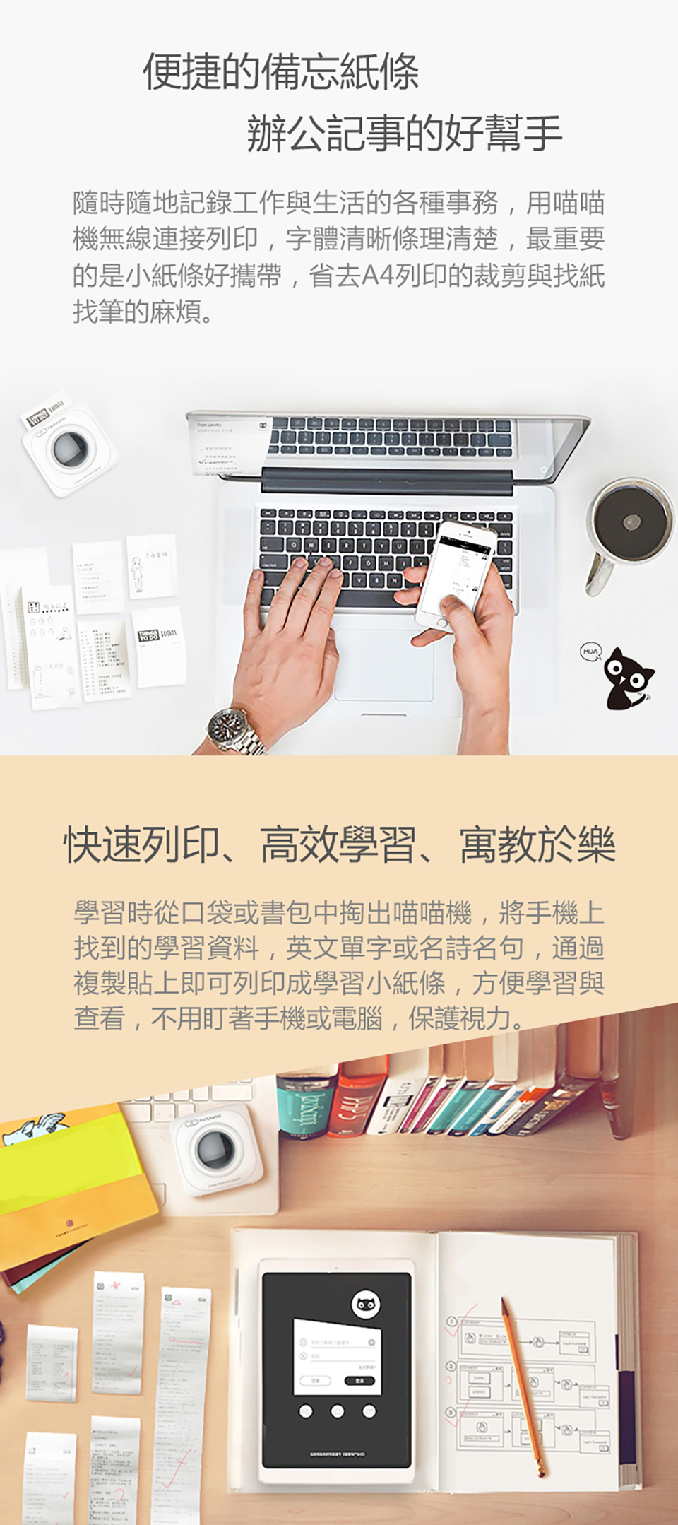 同時,喵喵機更是你辦公記事的好幫手,利用便利貼、待辦清單功能就能隨時記錄、隨時印製生活及工作的繁雜事務,小巧易攜帶的紙張便於貼在電腦前、記事本內提醒自己,也節省不少用紙筆紀錄的時間。