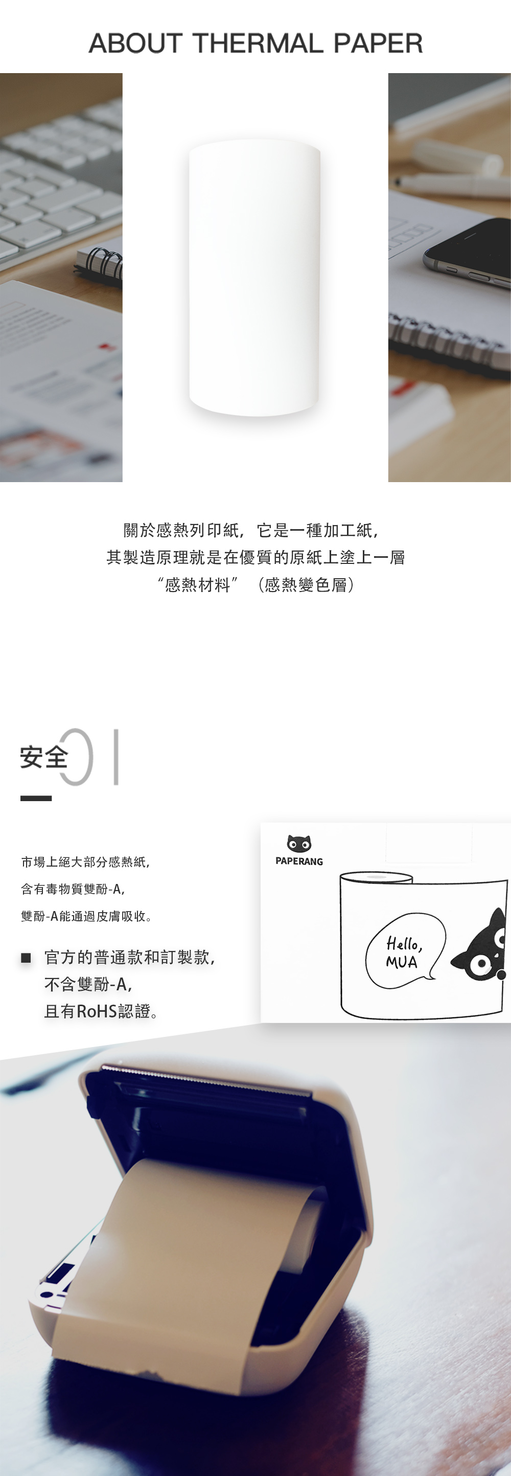 喵喵機不需要和拍立得一樣購買昂貴的底片,或是印表機所需的油墨,它只需要更入價格親民的感熱紙,利用熱感應列印來完成印製,其原理與我們在便利商店會收到的電子發票是相同的。不過市面上許多標示不明的感熱紙可能含有致癌物質雙酚 A,而喵喵機專屬的感熱紙則強調不含雙酚 A,並且通過歐盟危害性物質限制指令(RoHS)的認證!