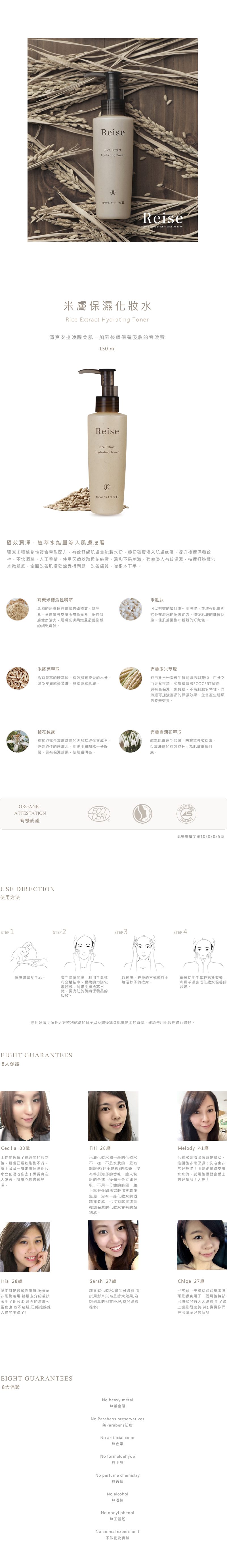 [Reise] is not just a skincare brand but has more to offer than excellent quality. The true meaning behind [Reise] is deeply related to our love to Taiwan. The beauty of life is all God's creation coexists harmoniously, so we believe products which respect the nature bring entirely satisfaction. Action speaks louder than words, as a green skincare brand, [Reise] takes real action to show our gratitude, cherish and respect to this land, and inspires people who also love this land to easily incorporate green ideas into daily life.