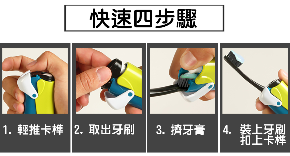 在拉出牙刷頭的過程中,只要順勢往牙膏罐按個一兩下,就可以擠出牙膏,練得順手些,就能一氣呵成完成整套作業,老實說還蠻帥氣的XD![]()