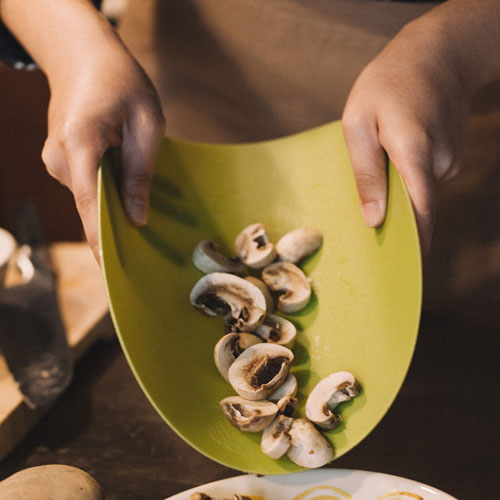 配可替換的薄型切菜板,防滑設計讓使用者可以直接鋪蓋在木頭砧板上使用,就像換了一個新的表面一樣,方便分開海鮮,蔬菜,熟食等食材,讓料理過程更衛生,更方便。