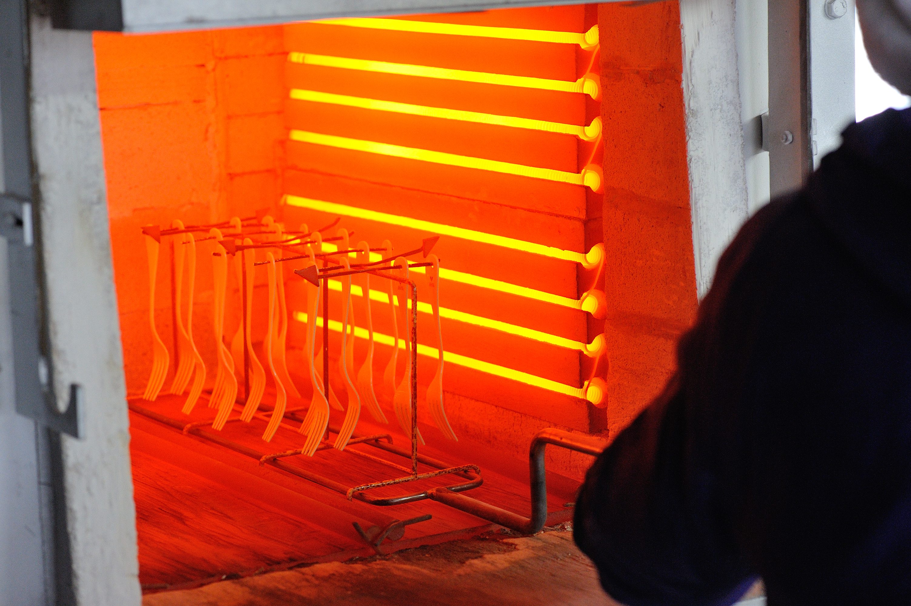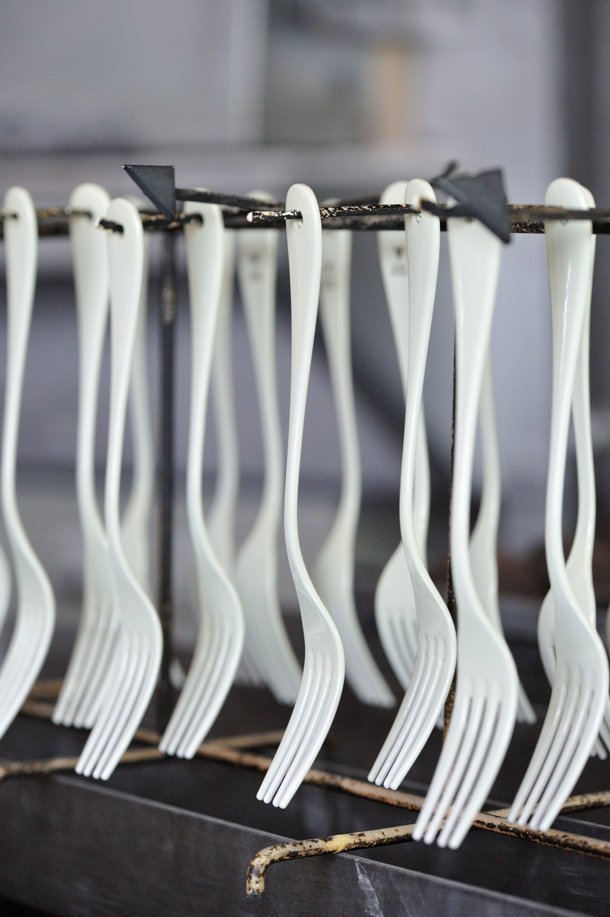 內在是紮實的鐵板,表面細細噴上一層玻璃質地的釉,在琺瑯的上釉製程中,大多是以吊掛的方式置放,本體和掛勾的接觸點往往因為接觸不到足夠的釉料而留下小黑點,或者有上釉不均的現象,雖然完全不影響正常使用,不過對於高桑金屬來說,卻還是不夠。