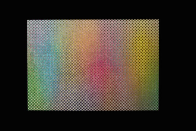 從遠處看來,「CMYK 色彩拼圖-顫動色版」彷彿沒有照著色域圖的分布,有種模糊與紛亂的感覺。定睛一看更像會流動一般,令人難以捉摸,這種亦動亦靜的迷幻風格,跳脫出既有的色彩框架!