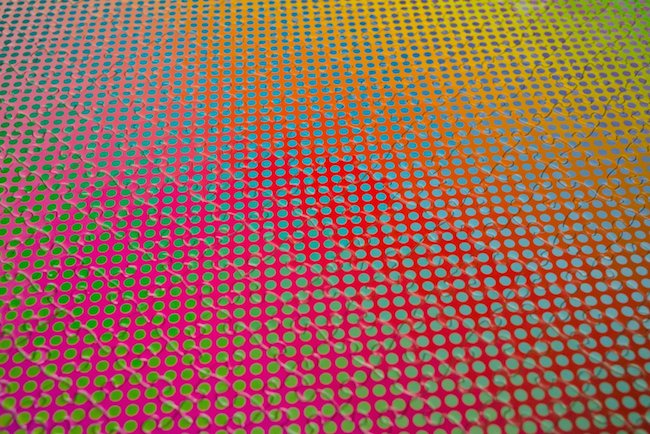 有趣的是仔細一看,便能發現一塊塊拼圖就像穿了圓點洋裝一般,而且這些圓點的大小一致,色系更是明確的對比色。