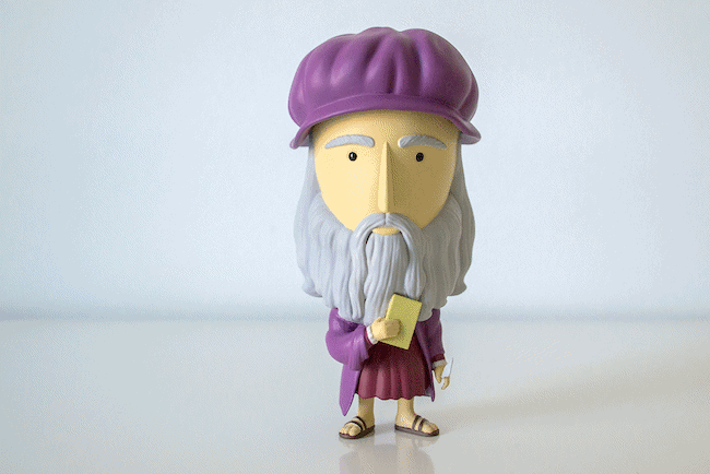 留著招牌白色大鬍子,身穿紫色長袍與紫帽的達文西,手拿素描本和羽毛筆,象徵他除了是藝術家之外,更是全能的音樂、建築、數學、生物等超多門學問的博學者。脫下帽子後還能呈現達文西的光亮的光頭,高度的反差讓他顯得更加和藹可親。
