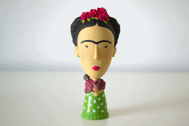 在芙烈達肩上的猴子是來自於《與猴子一起的自畫像》這幅她相當有名的畫作,對她來說猴子的存在是她孤獨時的心靈寄託。芙烈達胸前突出的心臟,也常出現在她的畫中,無比具體又如此強烈。但有趣的是這系列 Q 版公仔,成功的將關於芙烈達畫作的各種元素呈現,卻沒有帶來任何一絲痛苦的感覺,甚至是轉化成療癒人心的溫暖效果。