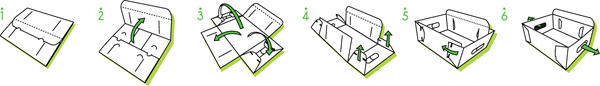 硬挺的紙板利用卡榫的設計來取代膠水,除了提昇便利性之外,更可以重複的拆裝,將成形的紙盒變回資