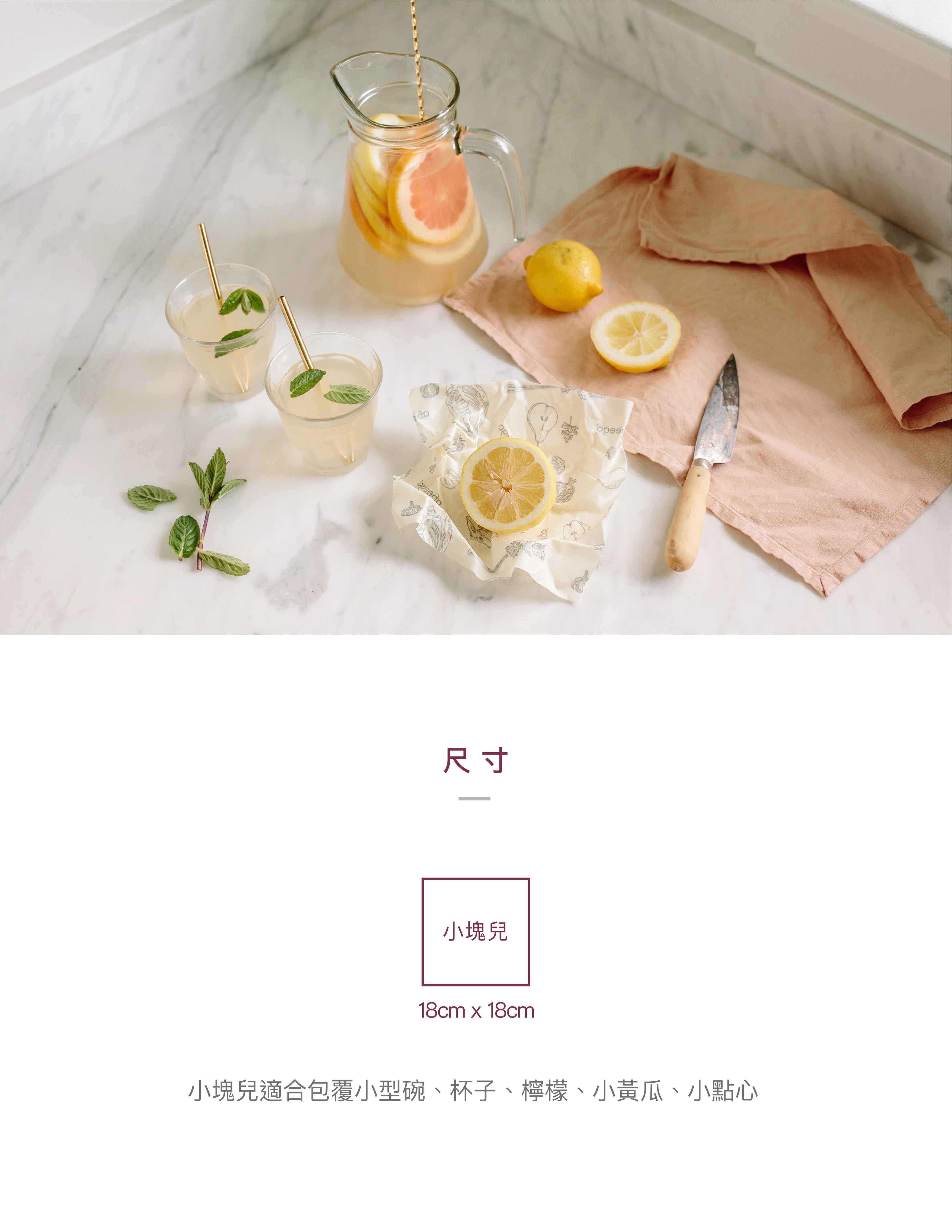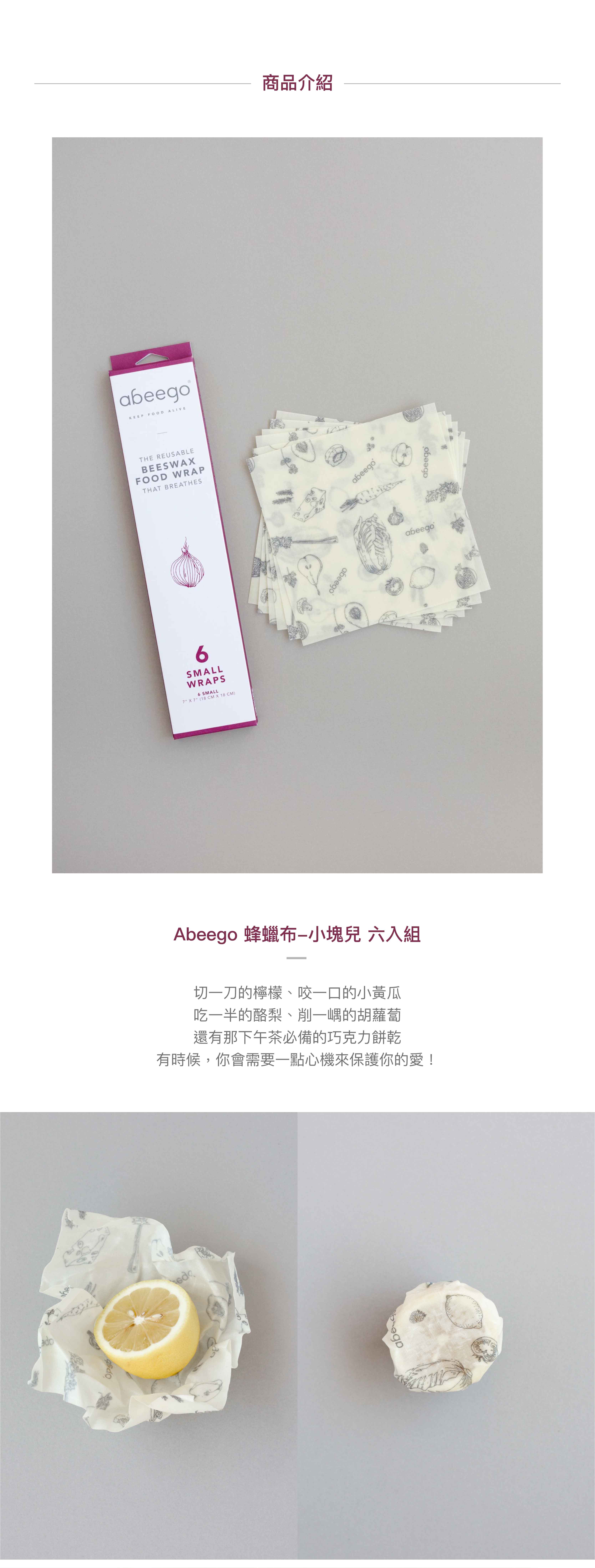商品規格品名:Abeego 蜂蠟布-小塊兒尺寸:18 x 18 cm cm;六入材質:樹脂、蜂蠟、有機荷荷芭油、棉麻織布產地:加拿大保存:未開封蜂蠟布約可保存3至5年注意事項蜂蠟布需使用冷水手洗,不能扭轉擰乾建議使用「無酒精、自然有機」的用品清潔污漬、染色和摺痕都是正常反應請遠離熱源與火,避免蜂蠟和樹脂融化可適時修剪邊緣,但盡量不要大塊裁切蜂蠟布使用前不需要沾水,用手即可讓蜂蠟布附著備註為了讓您的Abeego 蜂蠟布可以增加使用期限,她會需要您的細心與呵護!每張未開封的Abeego蜂蠟布約可保存3至5年,而使用中的蜂蠟布如果好好保存,是可以使用長達一年以上喔! -