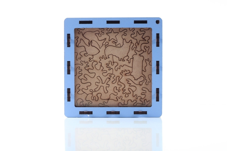 經歷多種的嘗試和探索,我們找到一種最適合生產木質拼圖的方式 : 二氧化碳雷射器發射高溫光束,經過多組的凸透鏡片把焦點對準材料表面,瞬間高溫將板材直接汽化,再用壓縮冷空氣將汽化後的物質從切縫中吹離。相較鍘壓千片只花不到十秒的紙板拼圖,海裡魚光是切割一幅一百片的就耗時至少十五分鐘,如此高成本的製程只為了提供最好品質。
