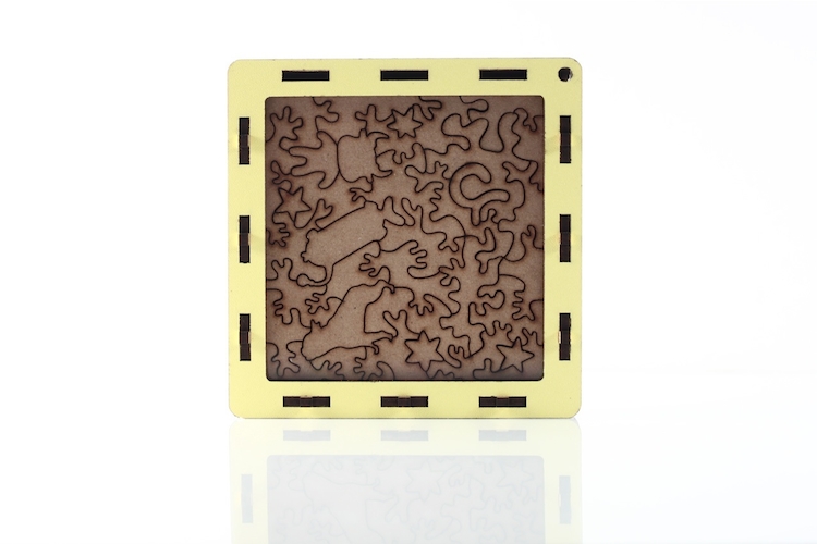 而木拼的靈魂在於材料。我們選用厚達6mm(少部分版本為3mm)的HDF高密度環保木質合成板,高溫高壓的製程讓木板防潑水、防蟲蛀且耐磨。在雷射高溫切割的過程中擁有極低的形變,不但留存圖面的原汁原味,也讓結構更加牢固。厚度更讓每個拼片質感大增,甚至可以輕鬆的個別站立,讓每個拼片都像是有生命的個體跳動穿梭在圖面間。