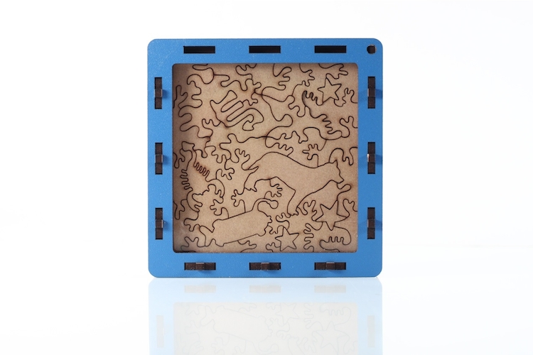 經歷多種的嘗試和探索,我們找到一種最適合生產木質拼圖的方式 : 二氧化碳雷射器發射高溫光束,經過多組的凸透鏡片把焦點對準材料表面,瞬間高溫將板材直接汽化,再用壓縮冷空氣將汽化後的物質從切縫中吹離。相較鍘壓千片只花不到十秒的紙板拼圖,海裡魚光是切割一幅一百片的就耗時至少十五分鐘,如此高成本的製程只為了提供最好品質。