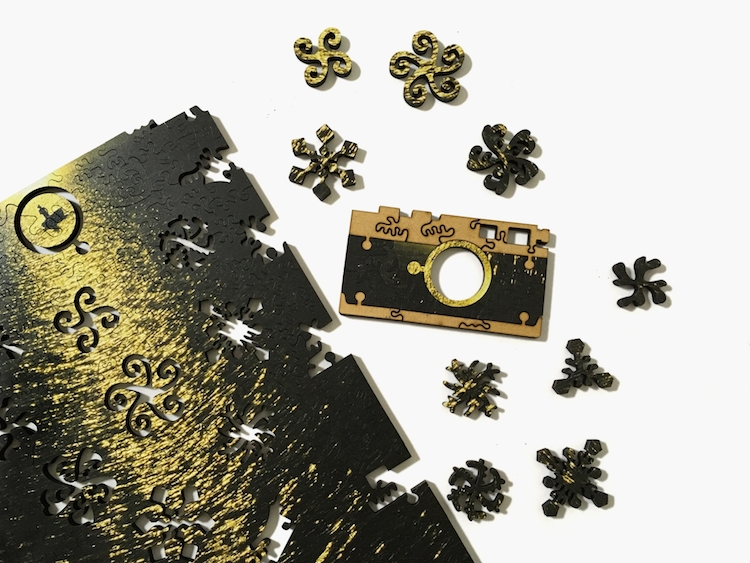 而木拼的靈魂在於材料。我們選用厚達6mm(少部分版本為3mm)的HDF高密度環保木質合成板,高溫高壓的製程讓木板防潑水、防蟲蛀且耐磨。在雷射高溫切割的過程中擁有極低的形變,不但留存圖面的原汁原味,也讓結構更加牢固。厚度更讓每個拼片質感大增,甚至可以輕鬆的個別站立,讓每個拼片都像是有生命的個體跳動穿梭在圖面間。