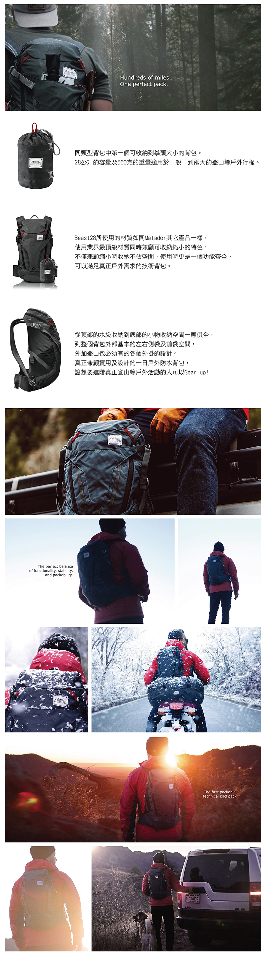 - Beast28所使用的材質如同Matador其它產品一樣,使用業界最頂級材質同時兼顧可收納縮小的特色,不僅兼顧縮小時收納不佔空間,使用時更是一個功能齊全,可以滿足真正戶外需求的技術背包。