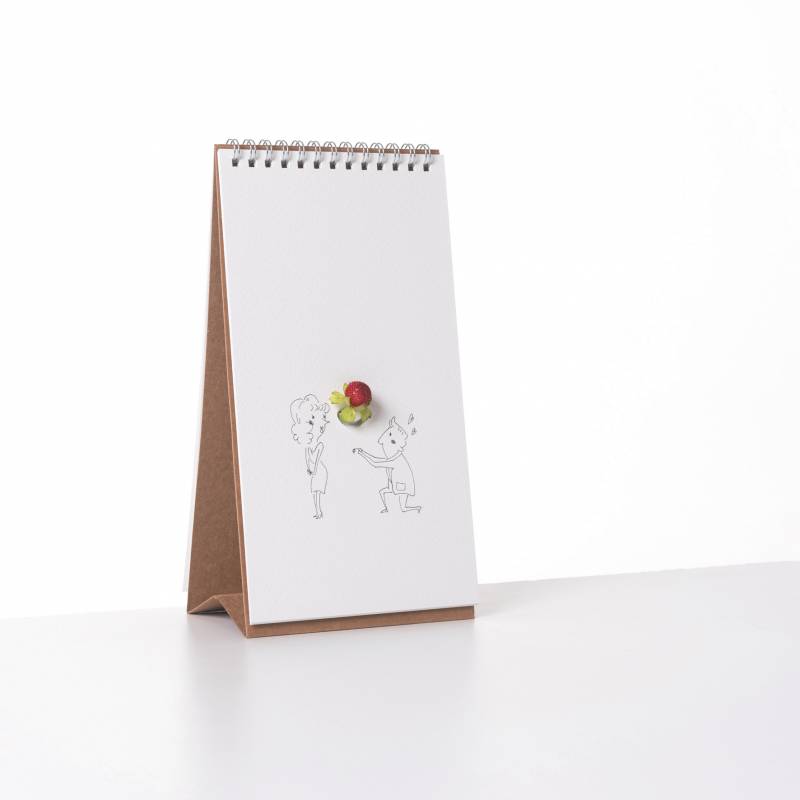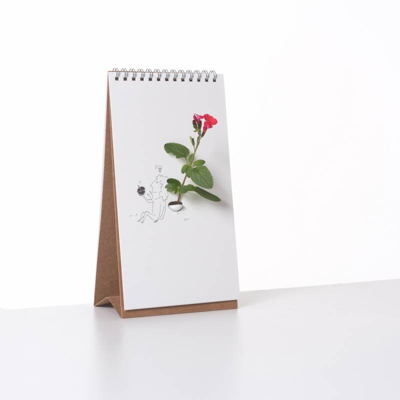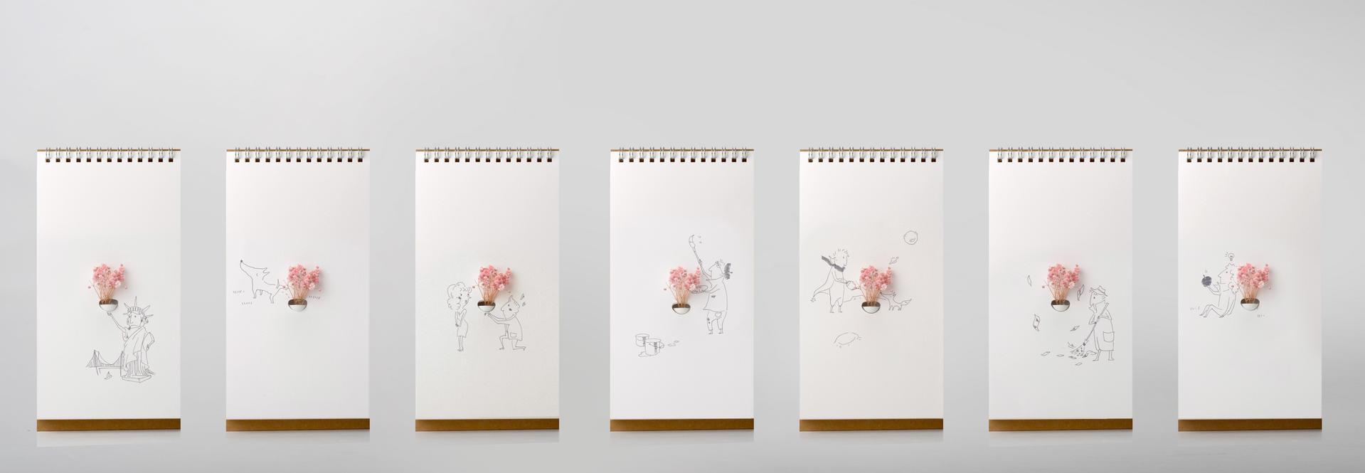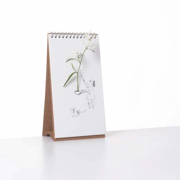翻頁花器是設計團隊突破框架,結合翻頁書和花瓶的作品,外觀看起來就像是一本桌曆,一頁一頁有著優雅的花瓶或人物插畫,但它卻有著一個能夠固定於翻頁書的花瓶,使用者可以將花朵插進這瓶容器中,再以心情翻動印有圖騰的書頁,搭配出不一樣的花花世界。