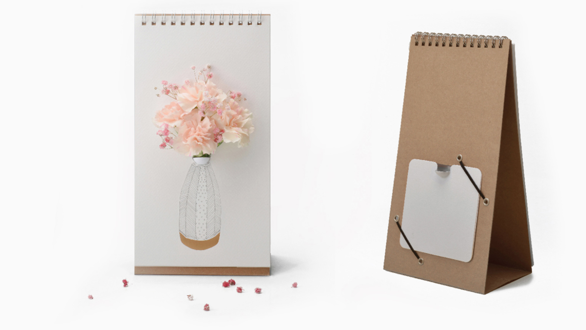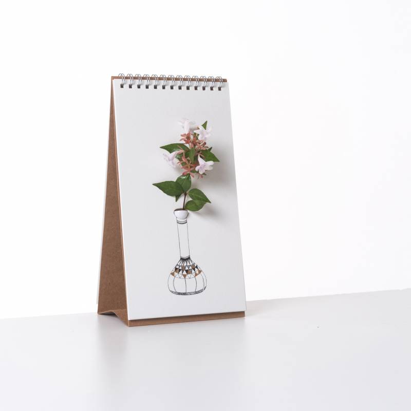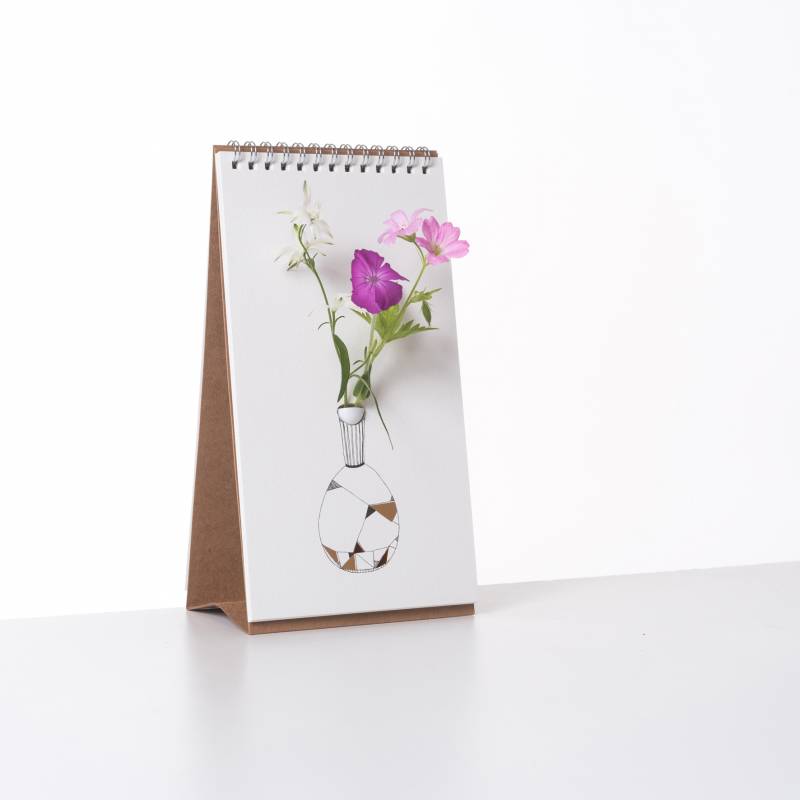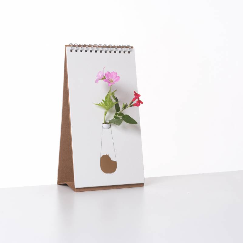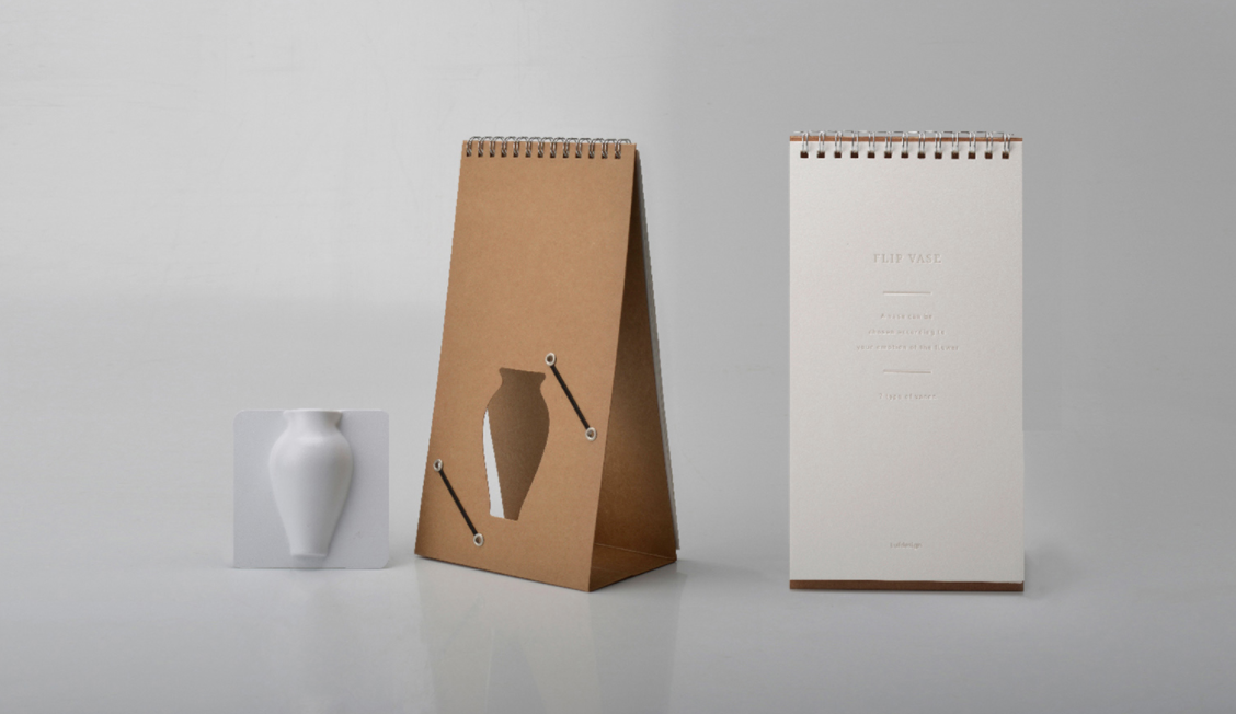 翻頁花器是設計團隊突破框架,結合翻頁書和花瓶的作品,外觀看起來就像是一本桌曆,一頁一頁有著優雅的花瓶或人物插畫,但它卻有著一個能夠固定於翻頁書的花瓶,使用者可以將花朵插進這瓶容器中,再以心情翻動印有圖騰的書頁,搭配出不一樣的花花世界。