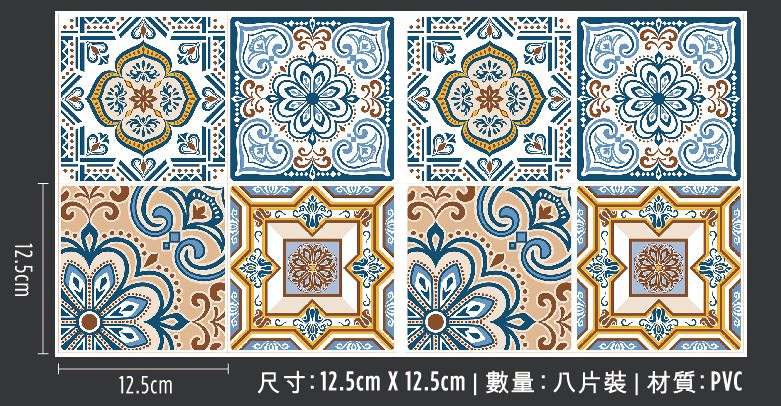 KNOWS&GOODS地中海花磚貼紙可以自由拼貼混搭花色也可單色黏貼組成連續圖案表面的「立體釉光防水層」,擬真磁磚般光澤防水 防油 耐熱 易清潔 可移除沾到污漬,用中性清潔劑擦拭乾淨即可只要撕開背膠紙 隨手貼上就開始DIY一把剪刀任意裁剪出想要的形狀不論是整面花磚牆,或是家具的局部裝飾小小的一個物件,就可以改變整個氣氛!使用說明1. 清潔:黏貼前先清潔牆面,確保牆面是平整乾燥的,以維持最佳黏貼密合度。2. 撕下:商品背面含有背膠設計,請撕開背膠紙。3. 黏貼:先定位好貼紙一角,確認角度及位置後,再按壓整張貼紙貼合牆面。☛拼貼小技巧:欲黏貼兩張貼紙時,可以重疊白色邊縫貼上,這樣交錯黏貼的方式讓貼紙更不容易滲水,而且貼起來真的好像細細的磁磚縫啊,超美的!注意事項▲ 使用此商品可完全覆蓋牆面嗎?・可以的喔。每一片貼紙都有不透光的白色底色,可以完全遮蓋你欲貼的表面。▲ 適合貼在哪些地方?・只要是乾燥平整的表面都可以貼。・商品本身防水、防油也耐熱,在客廳、臥室、書房、遊戲間等完全OK,但請避免長時間受到陽光曝曬,以免褪色。・廚房:商品耐熱度達60-80°C(140-176°F), 但仍要避開過度高溫環境,建議與火源保持30cm安全距離,避免發生危險。・浴室:商品材質防水,耐濕度達80-90%,高性能,防脫落,不會變形,但若長時間在潮濕環境仍會影響黏性,所以如果要貼浴室,請避免淋浴間或浴缸這類直接觸碰到水的區域,建議貼在乾濕分離的乾室,如洗手台前方、馬桶後方、四周牆面、門面、窗戶等貼起來都很美喔!・地面:貼紙本身沒有防滑設計,因此不建議大面積鋪在地上,還是要以安全為重啊。・家具:也可以貼在櫥櫃/中島/畫框/桌面/板凳作為裝飾喔。▲ 貼歪了或是想換花色怎麼辦?・商品可以立即性撕貼,只要撕下來,再對準位置重新貼上就可以了,但如果長時間黏貼之後才撕下,黏性就會隨著時間/重複撕貼次數/牆面材質而有不同程度的減弱喔。・想換花色直接撕下來就可以移除囉,再貼上喜歡的新花色即可。▲ 撕下來會不會有殘膠或破壞牆面?・若黏貼地方為磁磚、玻璃、實木、不鏽鋼等材質,撕下都不會有影響喔。如果是貼在粉刷油漆上,當貼的時間比較久,撕下時就可能會有掉漆的風險。・一般來說,黏貼在光滑表面上,幾乎不會有殘膠,但如果黏貼時間較久留下部分殘膠,這時可以使用肥皂水清洗,或搭配天然除膠去污劑就可以輕鬆去除了。▲ 花磚貼紙平時如何保養清潔?・由於商品表面有一層防水層,請避免使用表面粗糙如菜瓜布刷洗;建議使用軟布,搭配清水或加一點中性清潔劑就可以清潔乾淨了。商品規格材質:PVC,商品本身附背膠保固:新品瑕疵免運退換服務(限台灣地區)尺寸:每一片12.5cm x 12.5cm x 0.9mm(約七張A4的厚度)產地:中國重量:165克內容物:八片入,一包內含四種花色,每一花色各兩片![]()