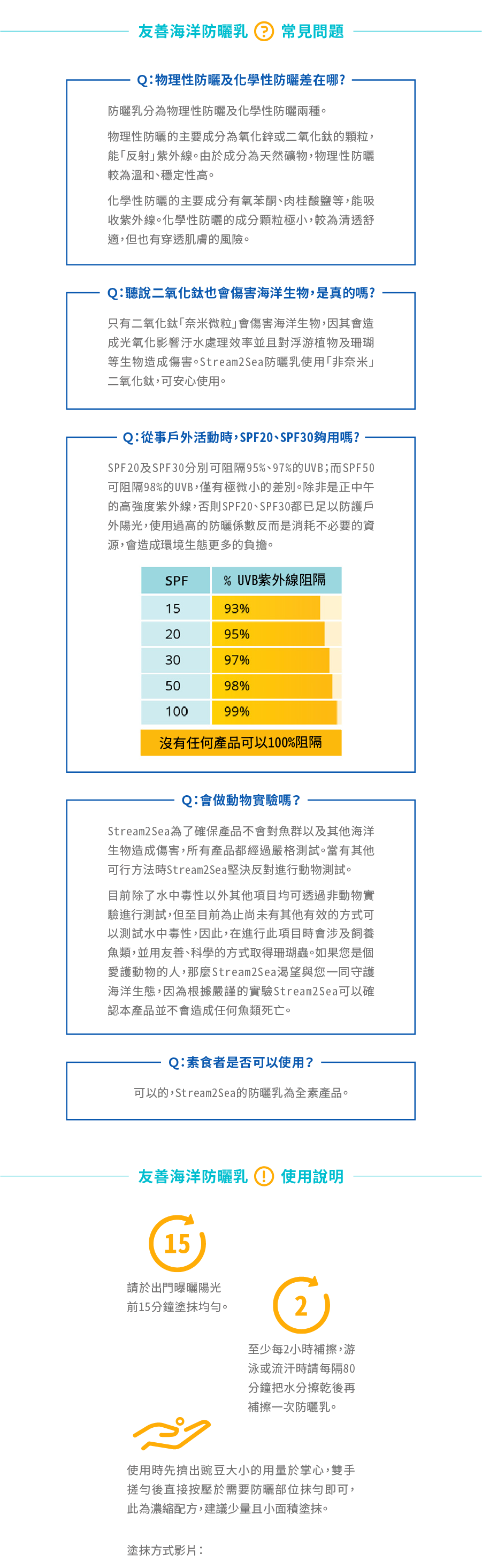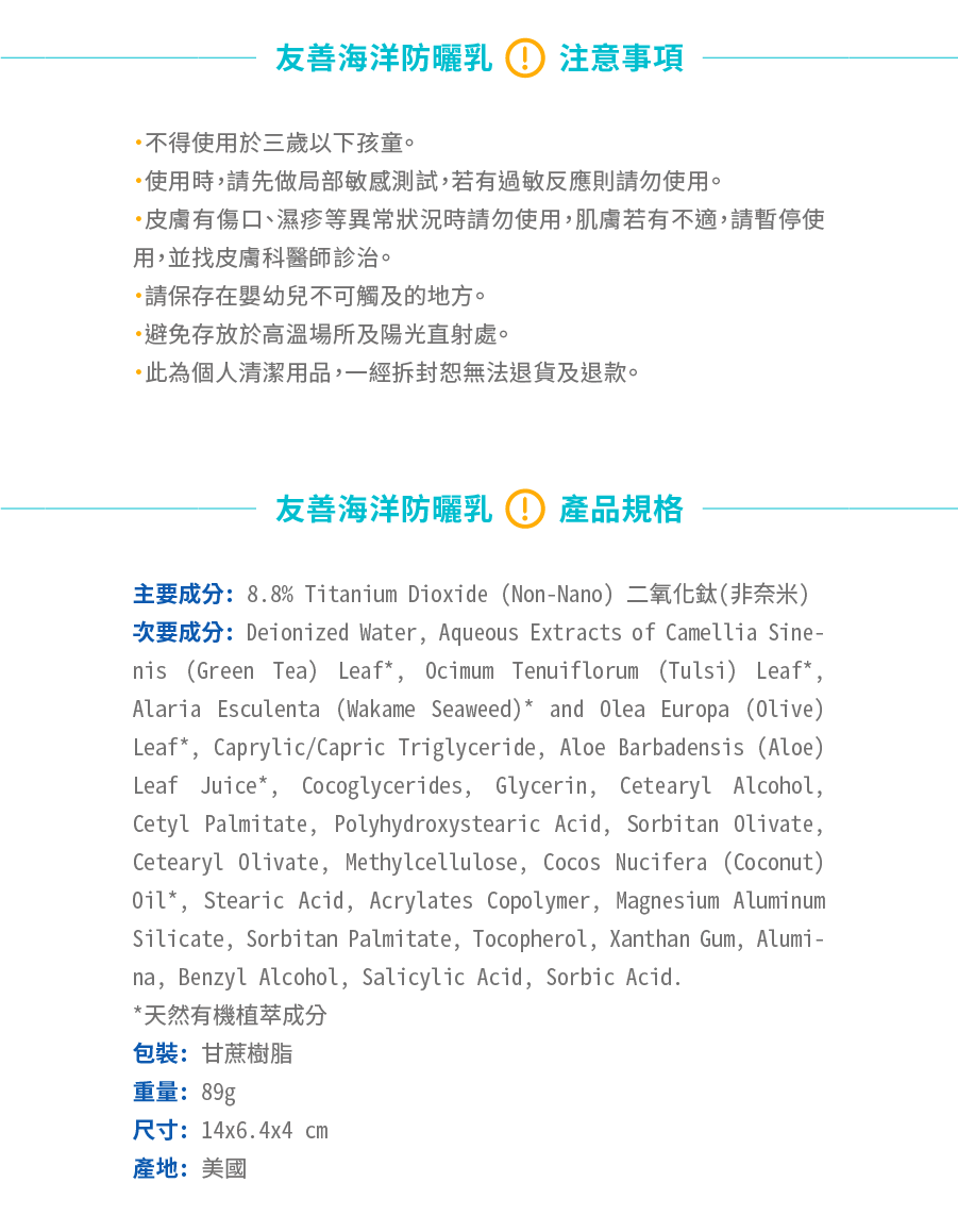 • 絕不含氧苯酮等傷害海洋生態或人體健康之成分