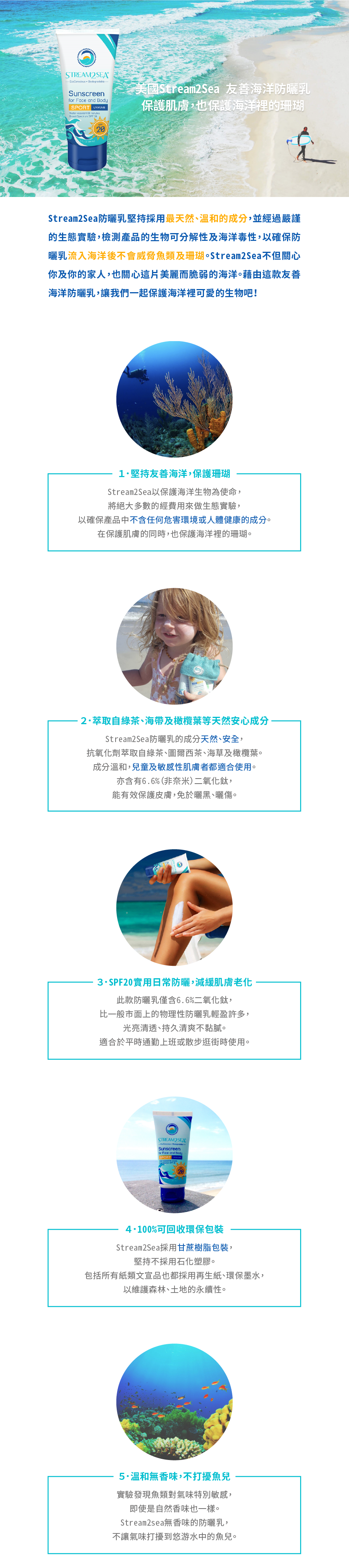 防曬可不是女孩們愛美的堅持,在這個連空氣都有毒的時代,捍衛自己的健康已經是全民共識,但是如果在保護自己的同時,也多關心地球和海洋(畢竟,環境的惡化就是因為它們的受損),才不會反而造成惡性循環~~美國 Stream2Sea友善海洋品牌,除了防曬之外,還有曬後修護、洗沐用品,,日用運動皆相宜,和大海一起當好朋友吧!更多品牌資訊連結