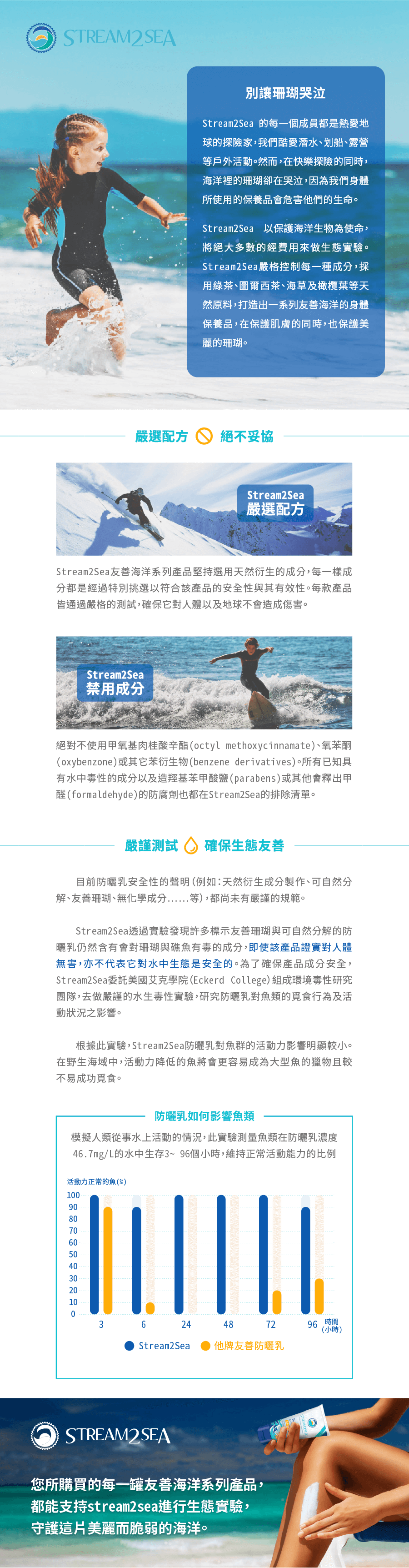 美國 Stream2Sea | 品牌故事專為友善海洋打造的防曬乳,保護肌膚,也保護海洋裡的珊瑚!來自美國的Stream2Sea,每一個成員都是熱愛地球、勇於冒險的探險家,酷愛潛水、划船、徒步旅行、露營、滑雪……等。然而,在我們快樂探險地球的同時,海洋裡的珊瑚卻在哭泣,因為我們身體上擦的防曬油會危害他們的生命。身為探險家,Stream2Sea 以保護海洋生物為使命,將絕大多數的經費用來做生態實驗。Stream2Sea嚴格控制產品中的每一種成分,採用綠茶、圖爾西茶、海草及橄欖葉等原料,極力打造出一系列專為友善海洋設計的防曬保養品,在保護肌膚的同時,也保護美麗的珊瑚。別讓有毒成分傷害我們的海洋很多人一定會很驚訝,其實防曬乳中的許多常見成分會毒害珊瑚礁。已有許多研究指出,我們身上擦的防曬乳流入海中,會直接導致珊瑚礁減少。據統計,每年因遊客水上活動會有6,000 至14,000噸的防曬乳流入海洋接觸到珊瑚礁,加速珊瑚白化。因為意識到防曬乳對環境的影響,Stream2Sea決定為地球做些改變。