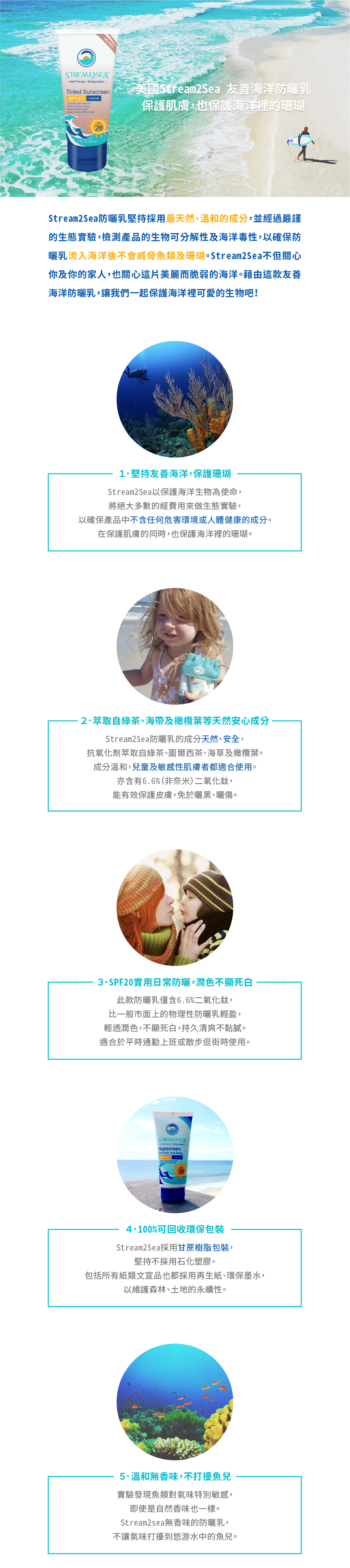 美國 Stream2Sea | 品牌故事專為友善海洋打造的防曬乳,保護肌膚,也保護海洋裡的珊瑚!來自美國的Stream2Sea,每一個成員都是熱愛地球、勇於冒險的探險家,酷愛潛水、划船、徒步旅行、露營、滑雪……等。然而,在我們快樂探險地球的同時,海洋裡的珊瑚卻在哭泣,因為我們身體上擦的防曬油會危害他們的生命。身為探險家,Stream2Sea 以保護海洋生物為使命,將絕大多數的經費用來做生態實驗。Stream2Sea嚴格控制產品中的每一種成分,採用綠茶、圖爾西茶、海草及橄欖葉等原料,極力打造出一系列專為友善海洋設計的防曬保養品,在保護肌膚的同時,也保護美麗的珊瑚。別讓有毒成分傷害我們的海洋很多人一定會很驚訝,其實防曬乳中的許多常見成分會毒害珊瑚礁。已有許多研究指出,我們身上擦的防曬乳流入海中,會直接導致珊瑚礁減少。據統計,每年因遊客水上活動會有6,000 至14,000噸的防曬乳流入海洋接觸到珊瑚礁,加速珊瑚白化。因為意識到防曬乳對環境的影響,Stream2Sea決定為地球做些改變。