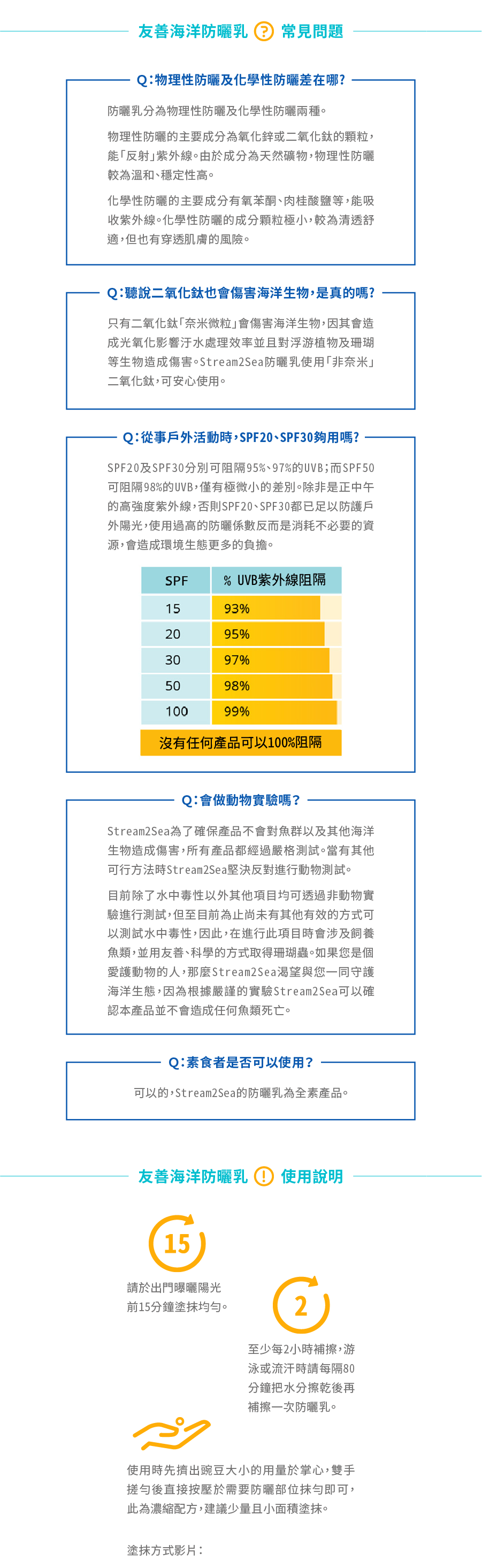 進一步研究顯示,SPF20 和 SPF50 之間的 UVB 阻隔力,其實僅約 3%,但是對肌膚帶來的負擔程度卻有明顯差異,這也是為什麼 Stream2Sea 防曬乳在產品設計上,僅做了 SPF20 與 SPF30 兩種,因為從效果來看,其實這樣其實就足夠了!