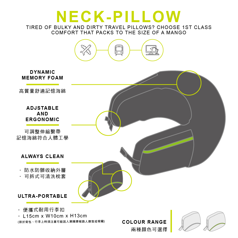 - Neck-Pillow是一款舒適但沒有變形功能的U型旅行頸枕,可收納至芒果大小,但不能打開成為趴枕或保潔枕。