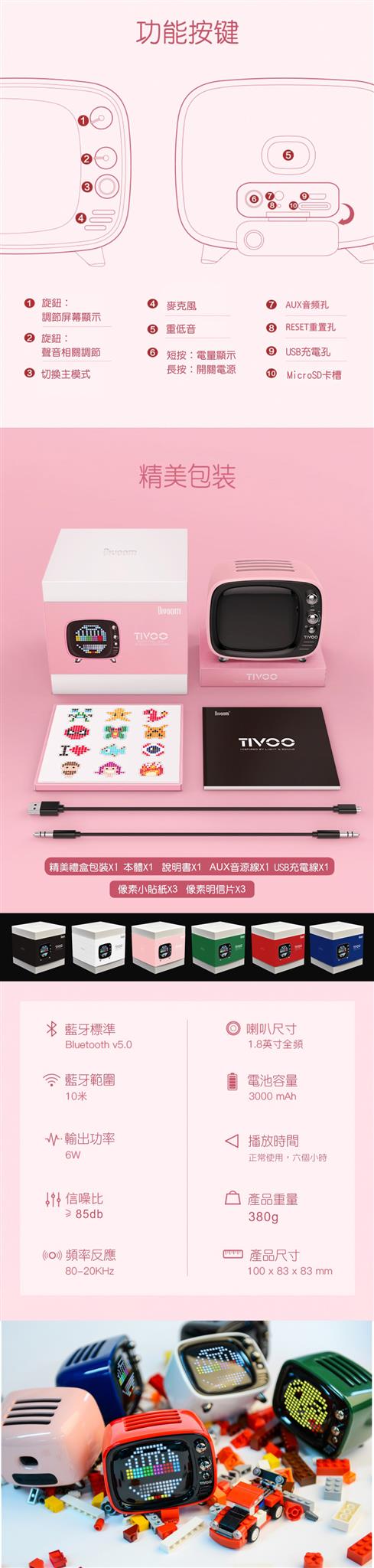 內容物:外盒包裝*1、Tivoo本體*1、說明書*1、aux音源線*1、usb充電線*1、小貼紙*3、明信片*3