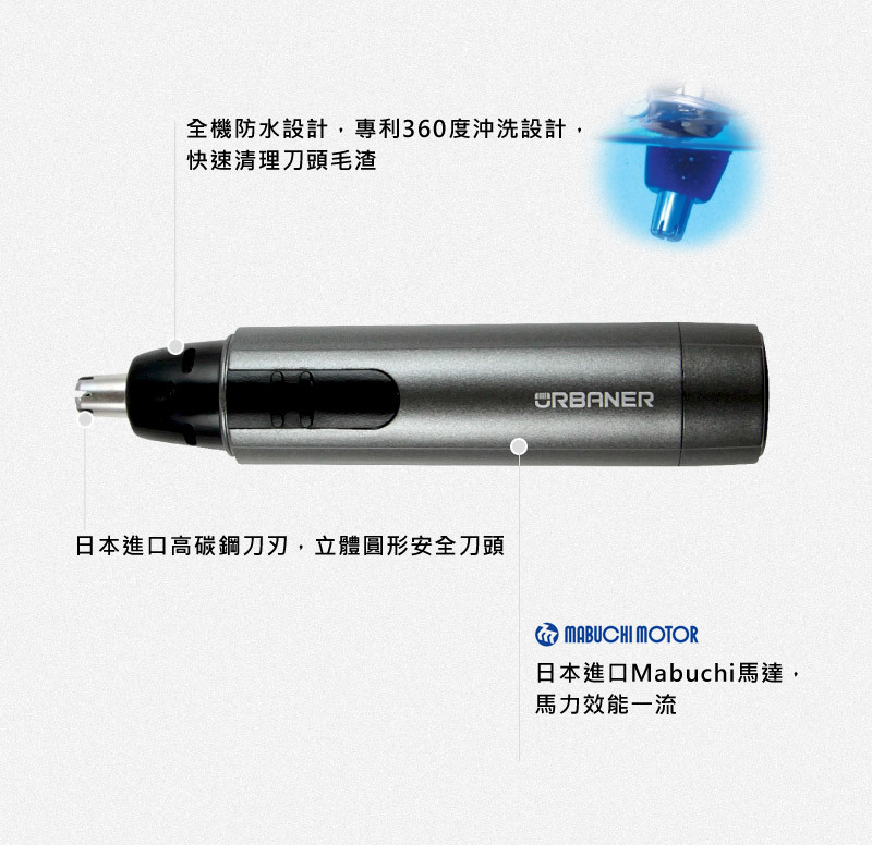 MB-041奧本電動鼻毛刀,全機精密防水設計,浴室使用也不怕水;刀頭專利設計,360度沖洗排毛水道,只要將鼻毛刀頭開啟,直接放在水龍頭下沖洗,鼻毛渣即快速清洗排出,清洗簡單、快速方便、乾淨衛生。