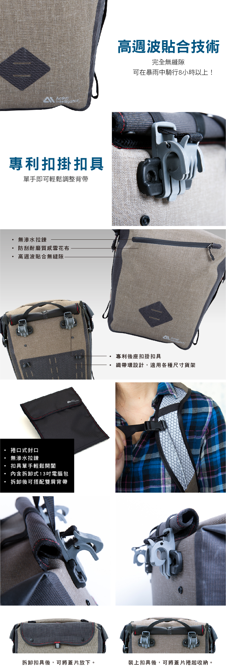 Taipei Cycle by iF得獎作品,搭配專利扣具,可將袋身勾掛置於單車貨架上。提起握把,即可輕易開啟扣具鉤爪脫離單車貨架。亦可將扣具掛勾從袋身上卸除,搭配雙肩背帶便成為日常使用後背包。