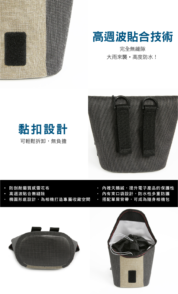 黏扣片式的開口設計,防水的表布內側有保護性良好的襯墊,方便隨手拿取或收納輕便型隨身相機,或者其他隨身電子用品。搭配單車專屬配件後可穩固的安裝於上管二側。