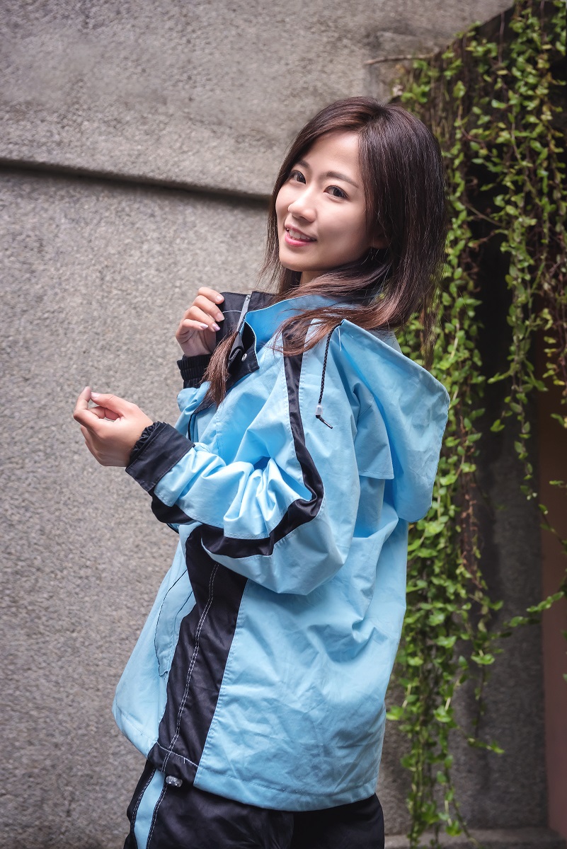 純棉製雨衣的上衣剪裁設計,以亮眼的淺色系為主。在寒冷的冬天裡,可當作防風外套使用;你不說,別人還看不出來它是雨衣呢!