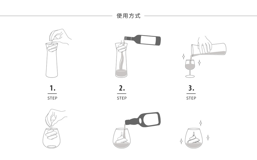 可簡單將其置於酒中1-2分鐘,即可享用超覺醒酒感。若飲用紅酒,則需搭配醒酒瓶。將紅酒於醇酒球上方倒入醒酒瓶中,酒水順著螺旋形流瀉而下後,取出醇酒球,便可將紅酒倒入杯中飲用。